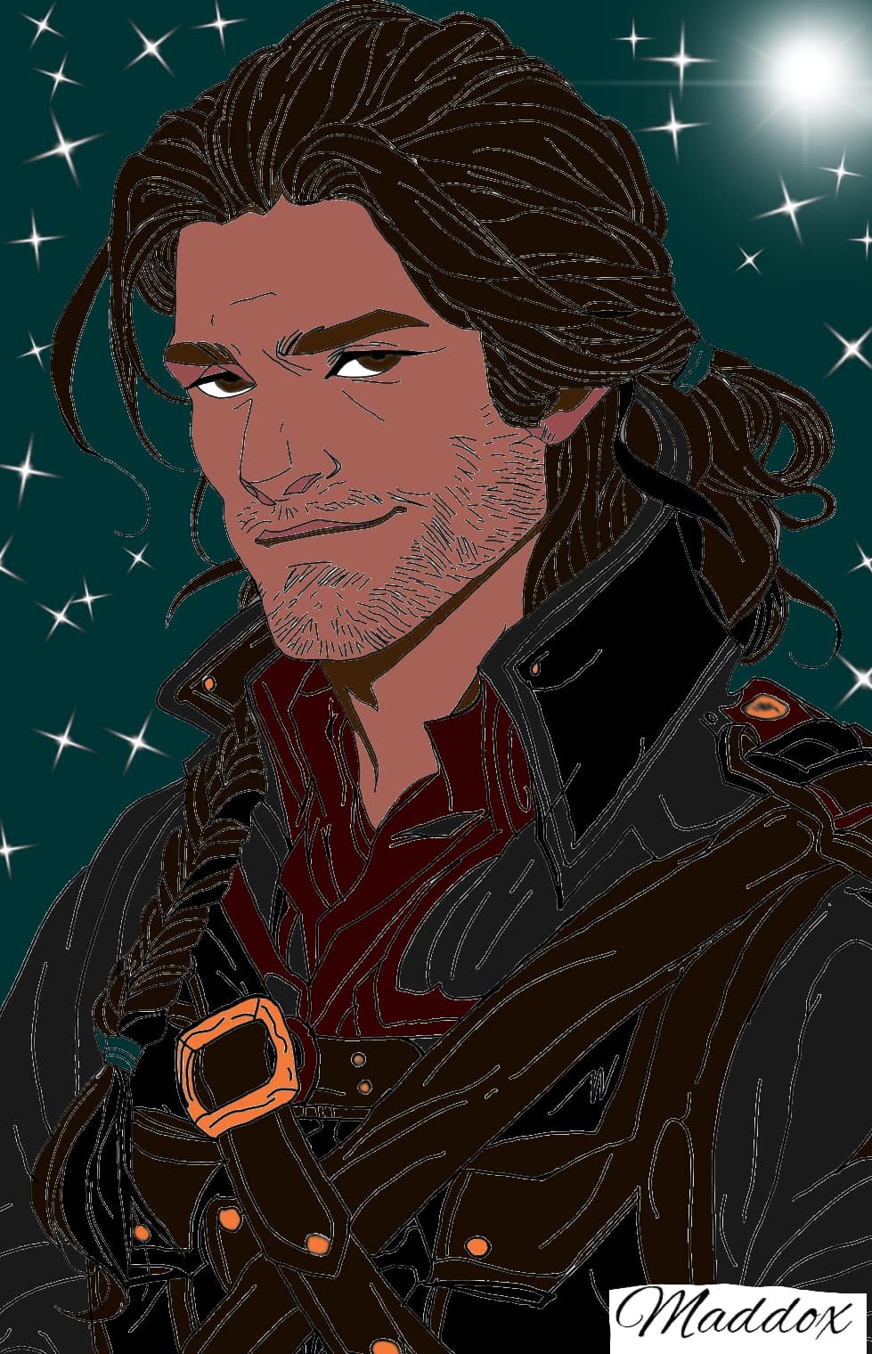 Maddox is the battle-tested knight providing the brute strength and tactical prowess the group needs to survive. Towering and imposing, with short black hair, a stern gaze, and bronze skin marked by scars, he dons rugged green armor that speaks to his life on the front lines. Once a loyal healer.